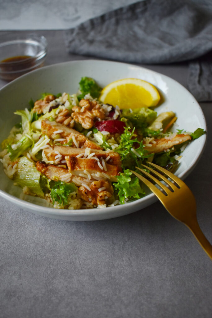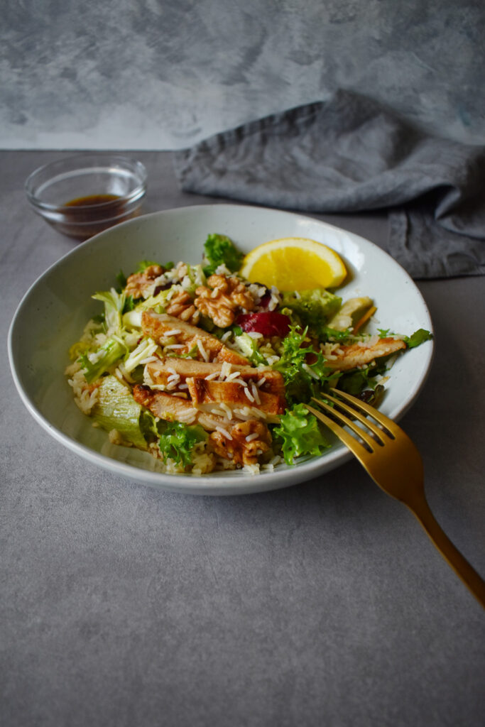Egy egyszerű salátának indult, csirkemellel. Aztán kezdett feltúrbózódni, ahogy a kezembe került a narancs és a balzsamecet. Akkor már tudtam, hogy ez több lesz, mint egy saláta. Ezért is kapott egy kis szénhidrátot még, rizs formájában. Úgy éreztem ez illik igazán az édeskés-savanykás ízhez. Mégsem mentem el az ázsiai ízek irányába, a sült csirke fűszersóval meghintett hús szépen megadja azt az élményt, amit a magyaros ízek kedvelői várnak egy csirkés salátától. A narancstól különleges, kicsit őszi-téli hangulata lett, de ahogy elfogyasztottam, tudtam, sokkal több van ebben a salátában. Minden évszak benne van. Az egész év, ami néha édeset adott, néha meg egy kis savanyút. De ez így lesz kerek egész.