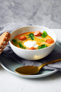 - Ha már minden puha benne, akkor egy kis tálban keverd ki a tejfölt. Adj hozzá néhány evőkanálnyi forró levet a levesből. (hőkiegyenlítés). Ezt alaposan keverd el, majd add a forrásban lévő leveshez és forrald ki, legalább 5 percig.