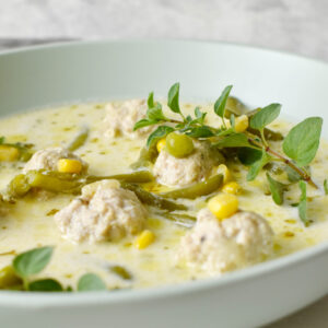 Húzd le a tűzhelyről és add hozzá a babot, a borsót, a kukoricát. (Ha ezek fagyasztottak akkor kicsit sercegni fog) Gyorsan öntsd fel vízzel. Sózd, borsozd és add hozzá a friss oregánó ágat. Forrald fel.