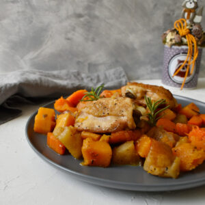Vegyél elő egy hőálló tálat és sütőtökös-répás-almás keveréket öntsd bele. Terítsd el és tedd rá az elősütött csirkecombokat.